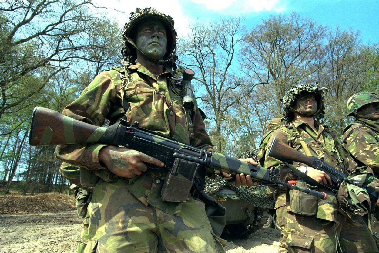 De nadagen van de FAL tijdens een oefening in 1996. De militair heeft twee magazijnen aan elkaar getaped en groene tape als camouflagepatroon op zijn geweer geplakt.