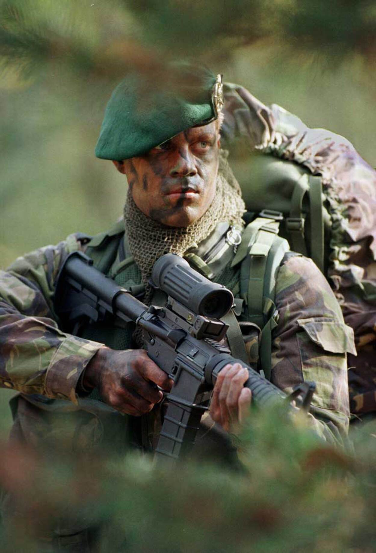 Nederlandse commando met groene baret en Diemaco C8 achter bladeren.