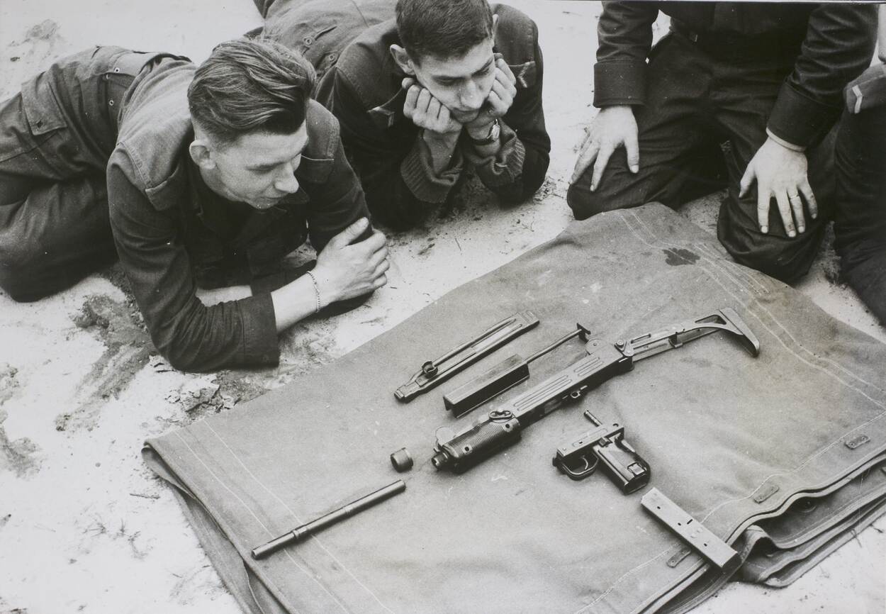 Landmachtmilitairen liggen voor een doek met daarop een gedemonteerde Uzi.