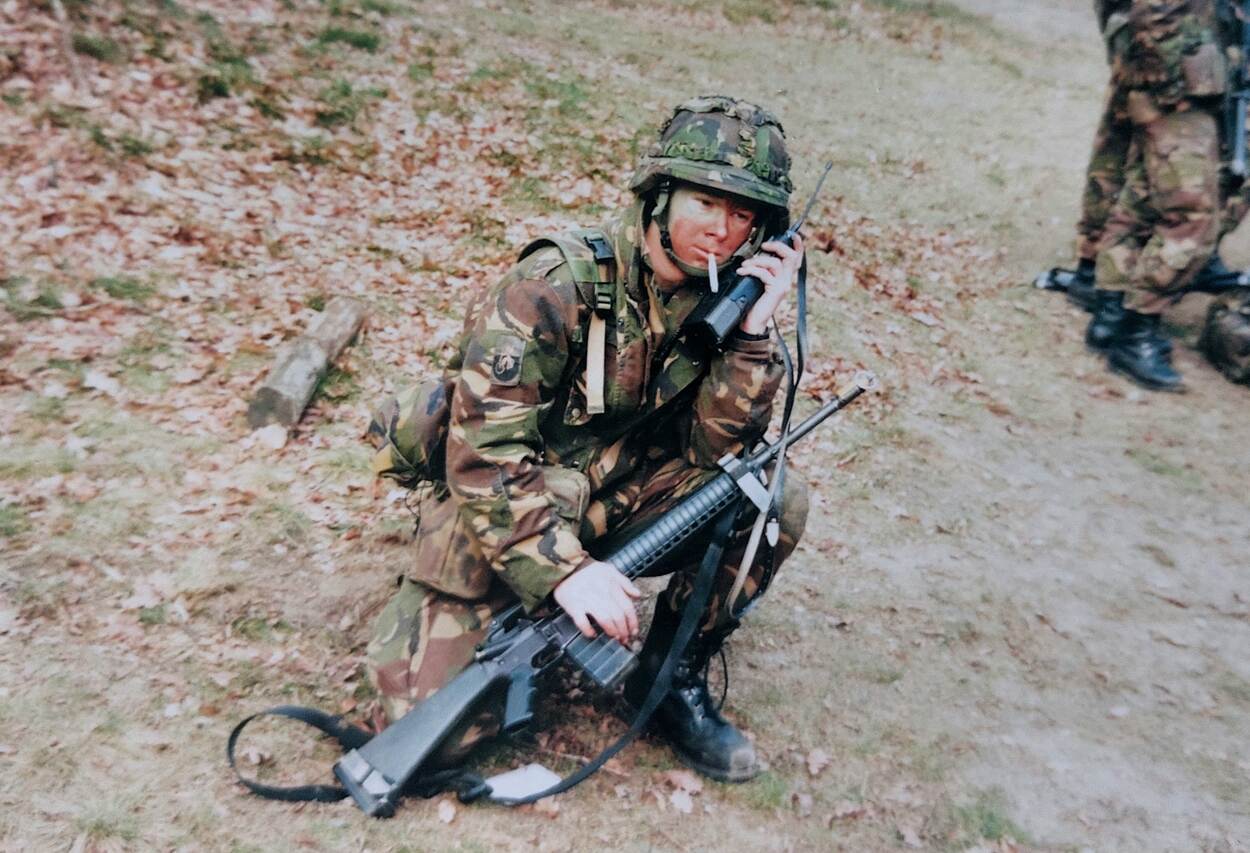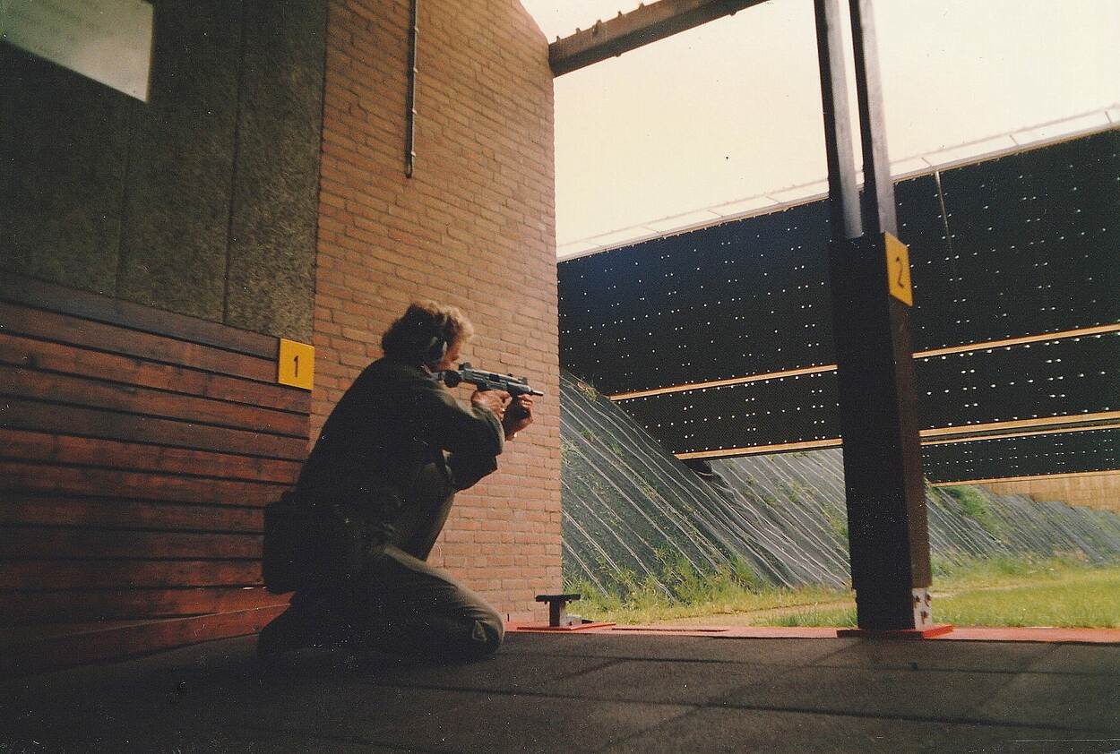 Joan Plaatsman met Uzi op de schietbaan in zijn NatRes-tijd.