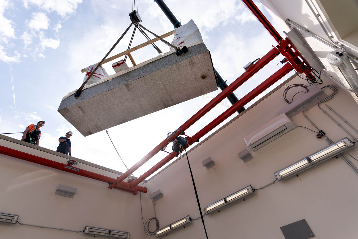 Het nieuwe röntgensysteem staat op een granieten blok. Met behulp van hijskranen is het apparaat in de nieuwe munitiewerkplaats gehesen.