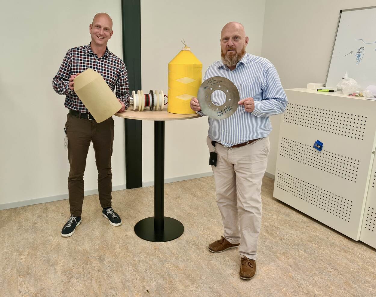 Projectleider Ted (links) en hoofd instandhouding & projecten Koos zorgen voor de veiligheid van de pijpleiding in de Nederlandse bodem. Ted heeft de hardefoam PIG in handen, Koos een zogenoemde (aluminium) gaugeplaat, waarmee eventuele oneffenheden in de pijpleiding zijn te bespeuren.