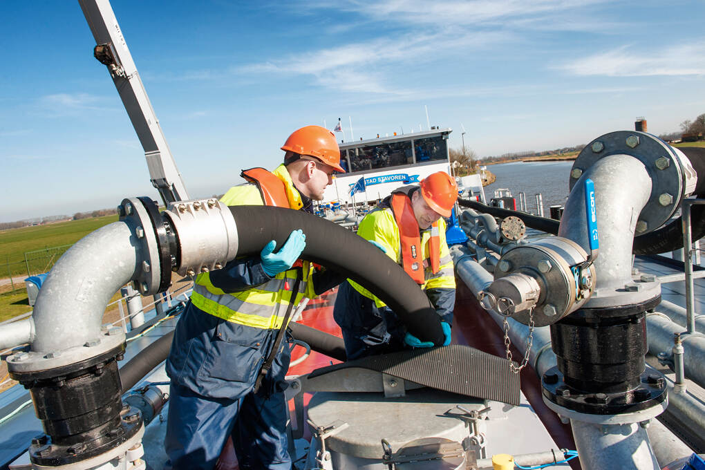 Een schip met brandstof voor Leeuwarden op het Van Harinxmakanaal bij Deinum wordt ontladen.