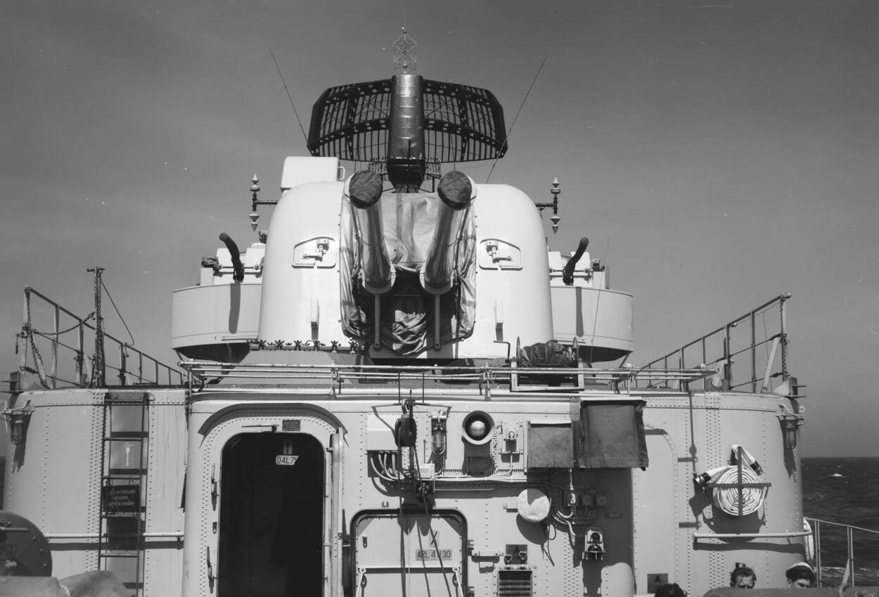 Commando-overdracht van de onderzeebootjager Hr.Ms. Gelderland (D 811) in april 1973, voor een van de geschuttorens.
