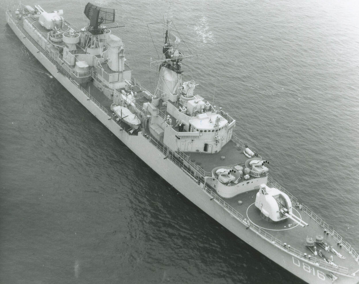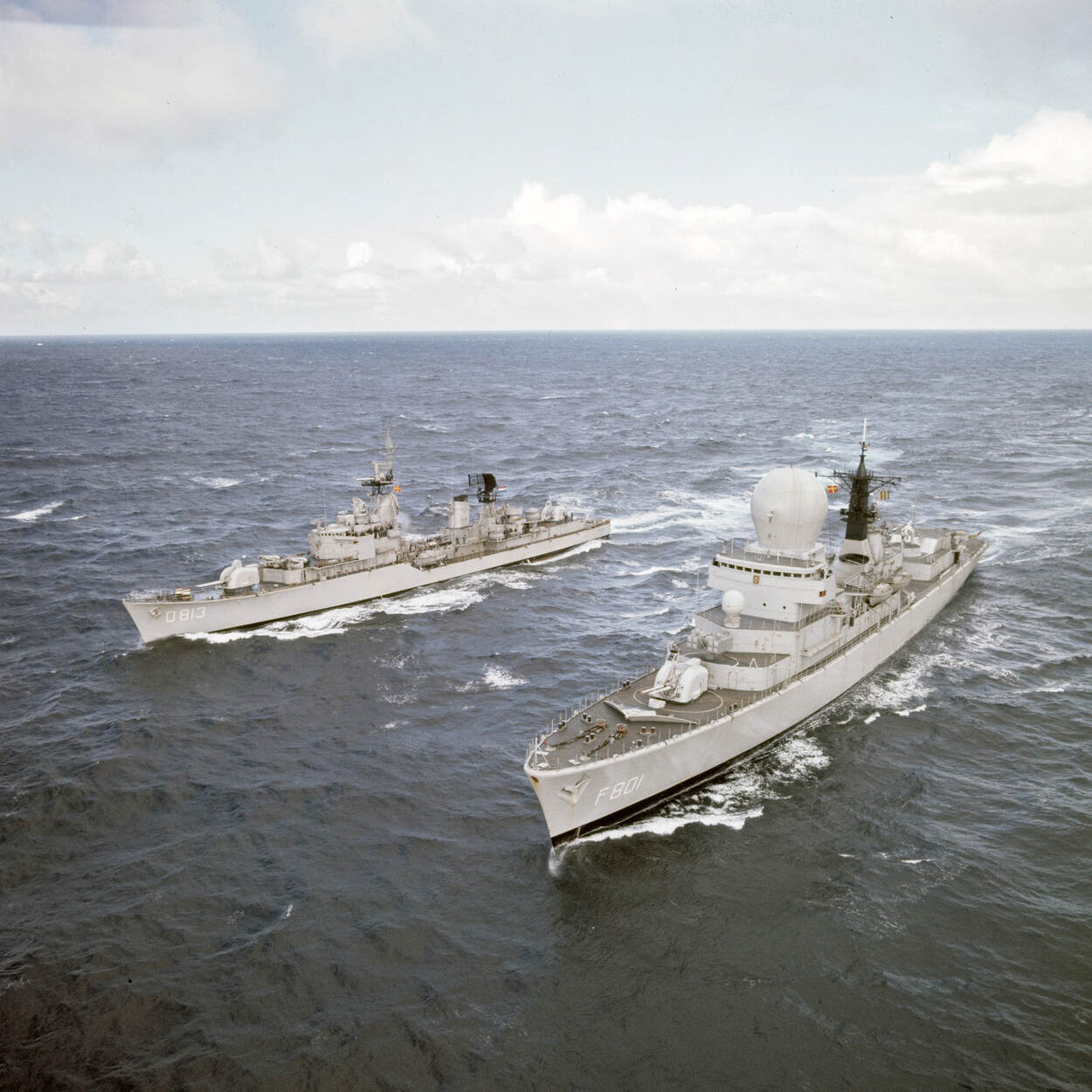 Hr.Ms. Groningen (links) naast het nieuwe fregat Hr.Ms. Tromp in 1980. Beide met hetzelfde geschut op de bak.