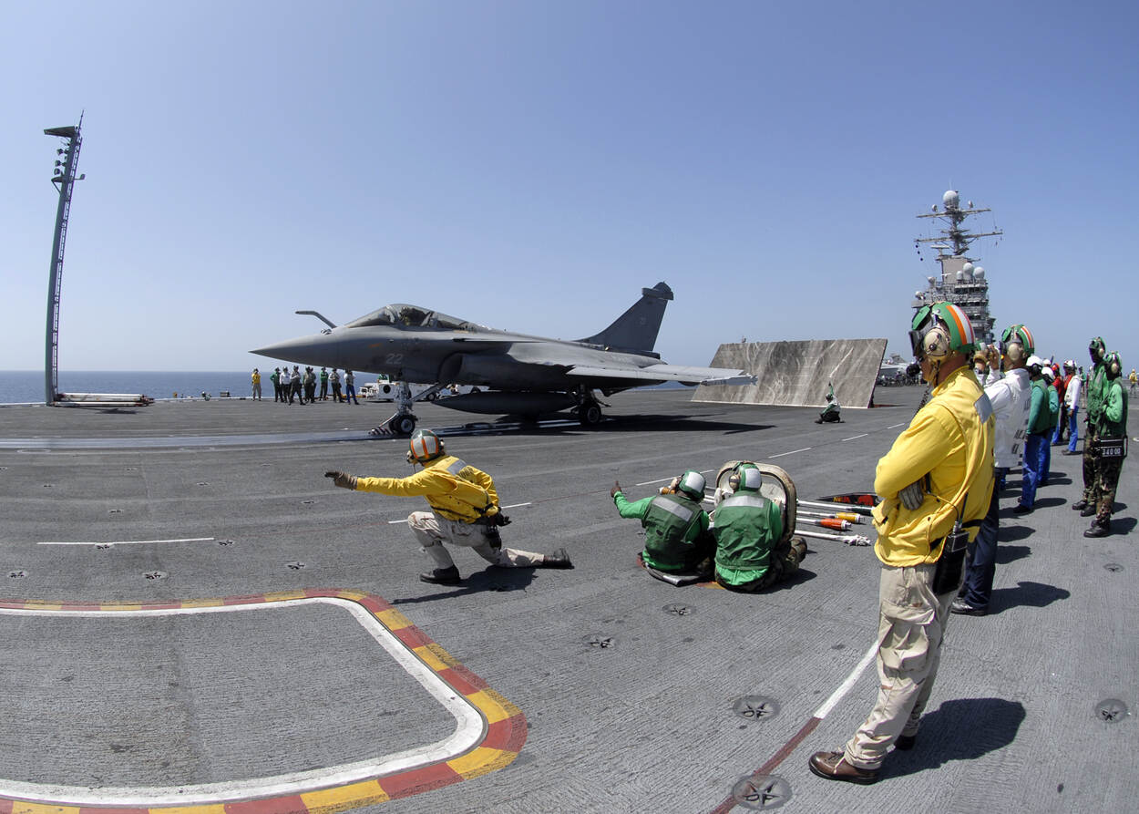 De Rafale M is speciaal ontworpen voor operaties vanaf een vliegdekschip en opereert al enige tijd vanaf de FS Charles De Gaulle. India heeft twee vliegdekschepen: INS Vikrant en INS Vikramaditya. Op de foto vertrekt een Franse Rafale van het Amerikaanse vliegdekschip USS Theodore Roosevelt. (Foto: John Stratton)