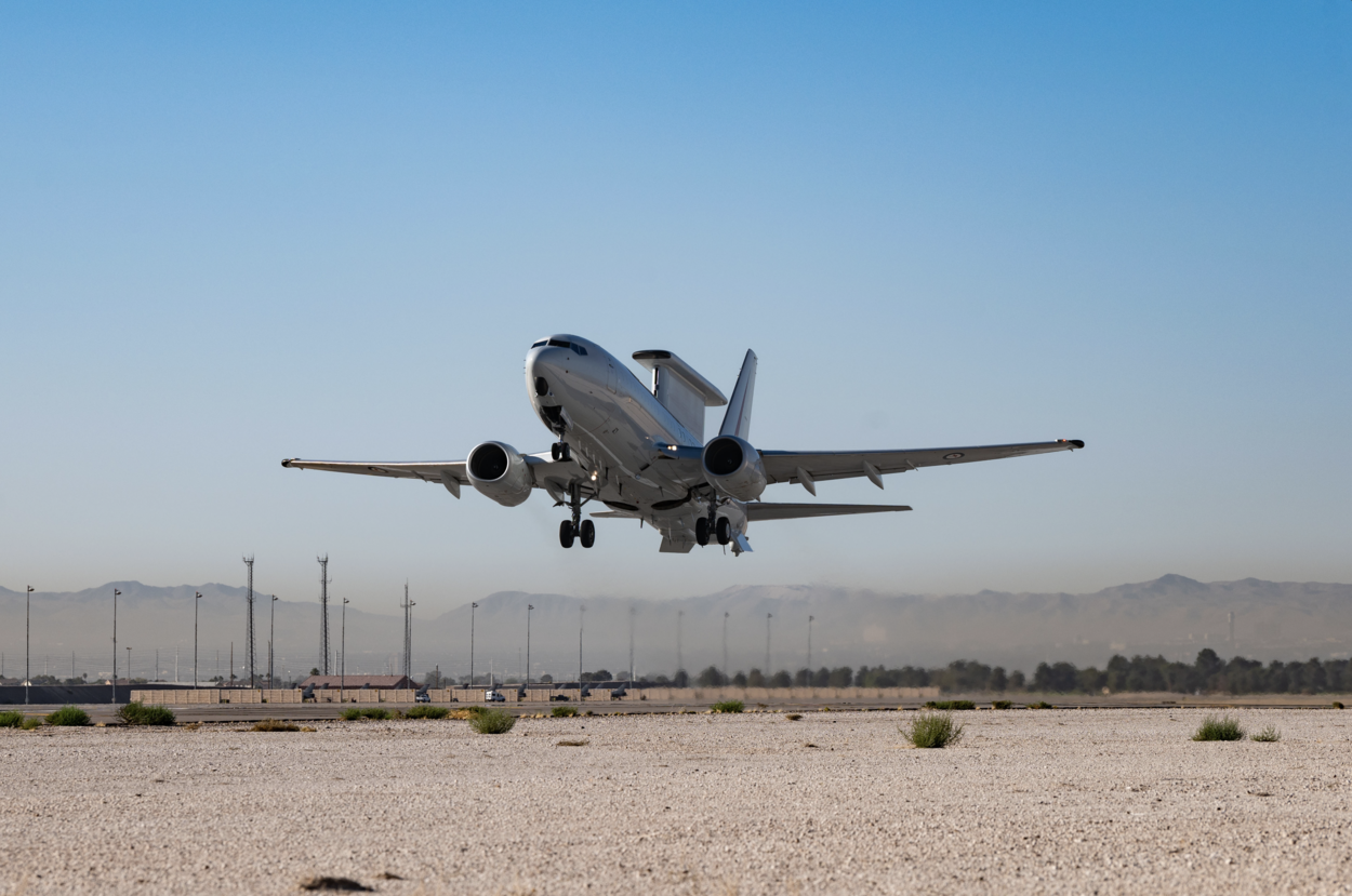Op onderstaande foto, van de Amerikaanse luchtmachtmilitair Timothy Perish, vertrekt een Australische Wedgetail van Nellis Air Force Base.