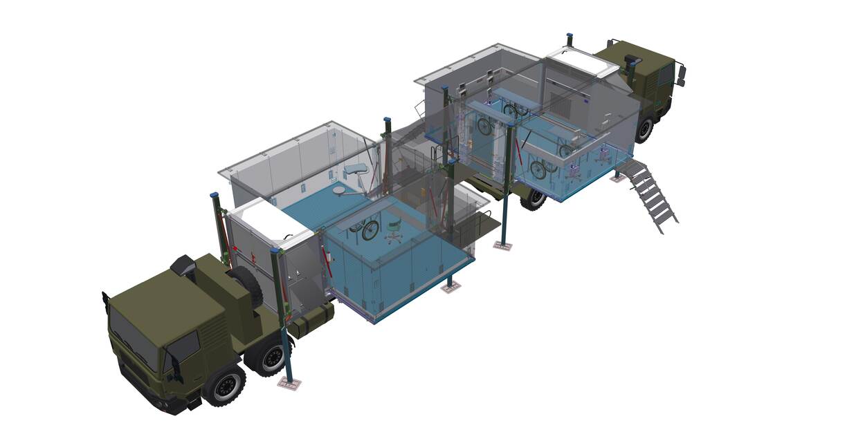 Elk systeem omvat een airconditioning-unit, een stroomgenerator en een noodoperatie-container die is uitgerust met de nieuwste medische instrumenten. De hulpposten maken deel uit van het Modulaire Medische Faciliteiten (MSE)-systeem van de Bundeswehr. (Tekening: Rheinmetall)