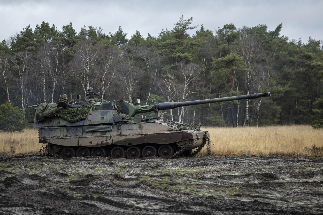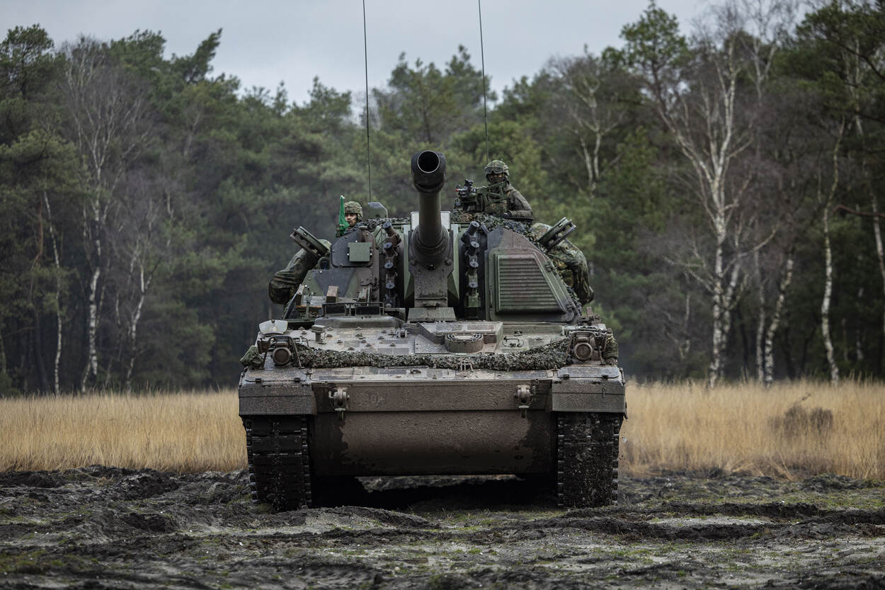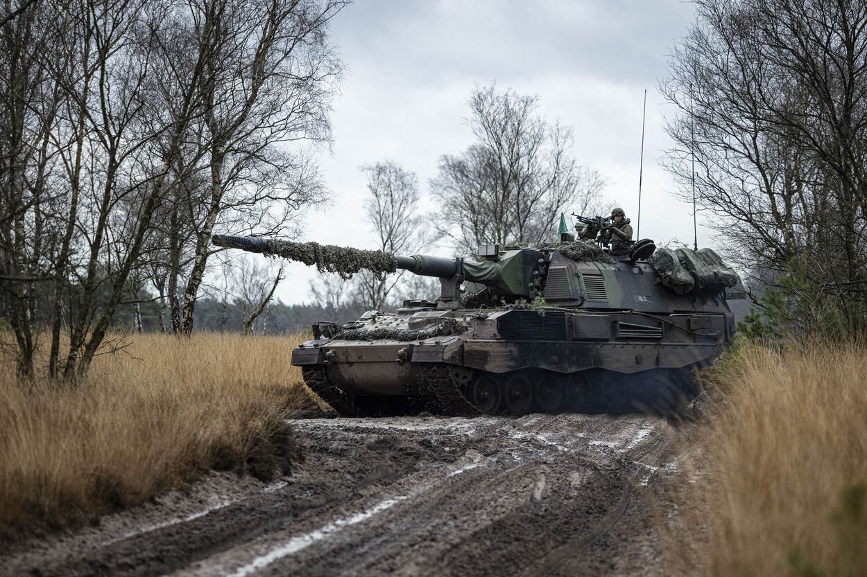 Deze PzH is klaar voor inzet voor de Navo. De schietbuis is gecamoufleerd om reflectie en ontdekking door drones tegen te gaan.
