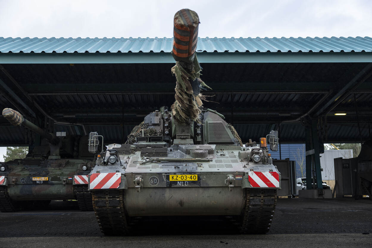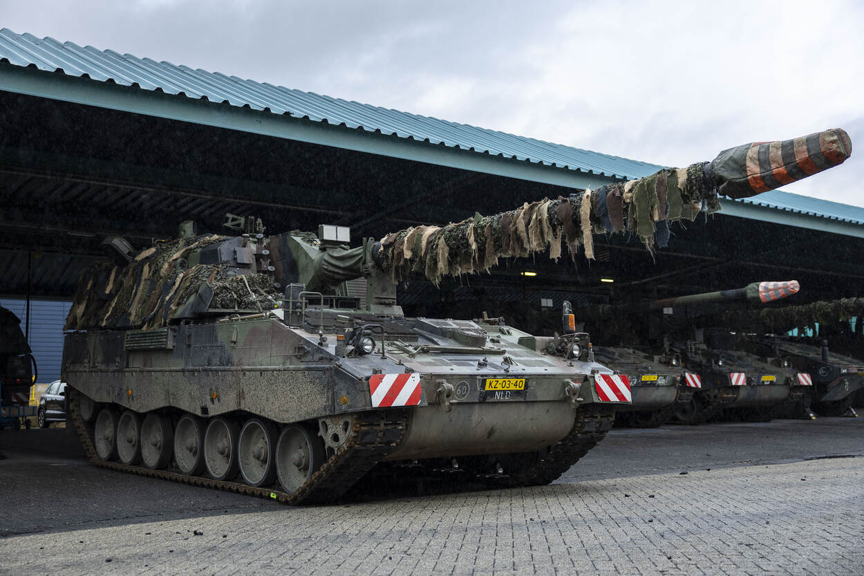 Op de Tonnetkazerne in ’t Harde staan de PzH’s op een rij geparkeerd voor onderhoud.
