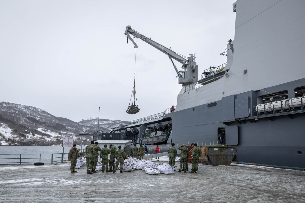 Mariniers, voertuigen en materieel worden tijdens Joint Viking vanaf Zr.Ms. Johan de Witt aan land gebracht.