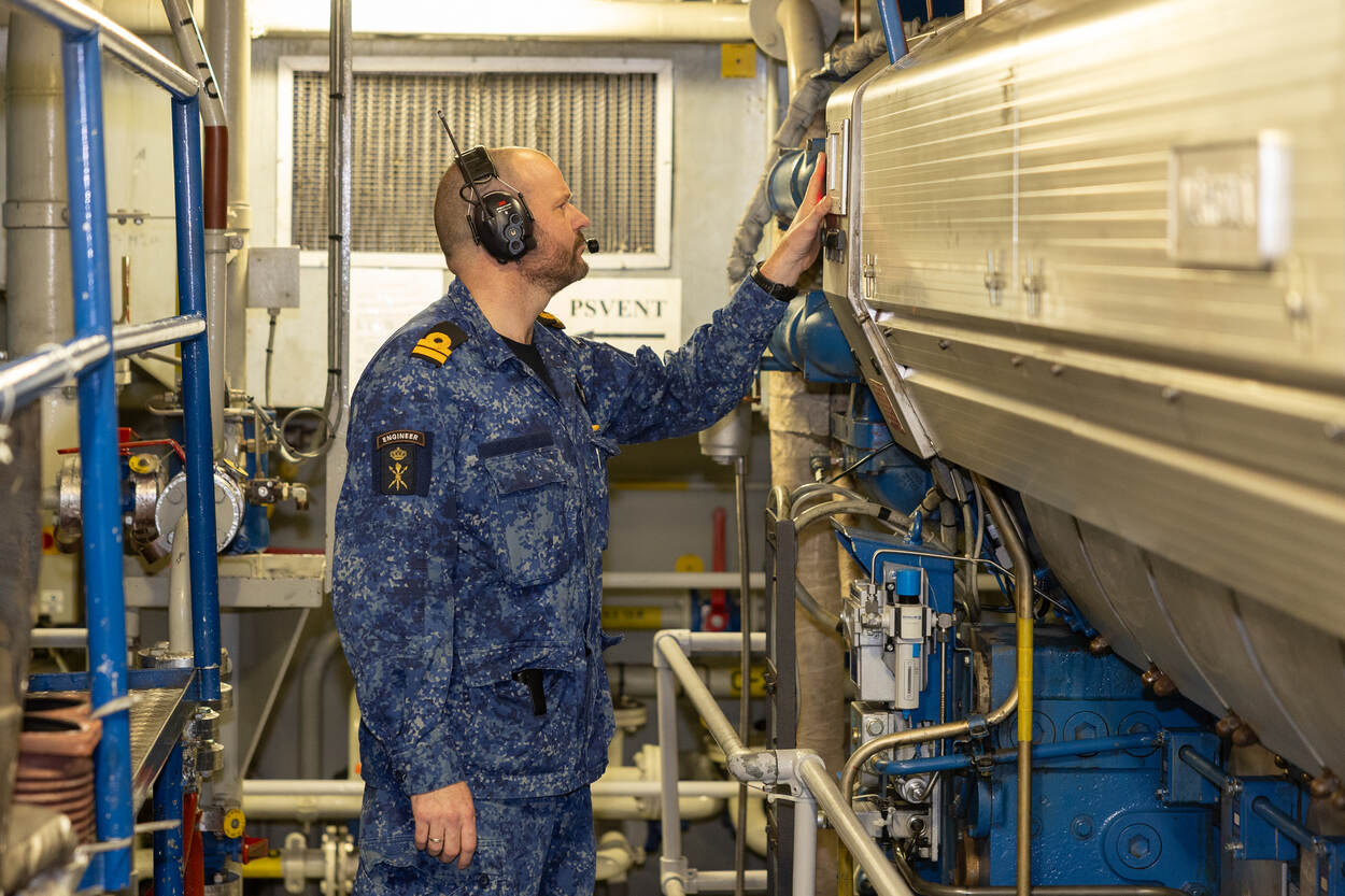 Luitenant-ter-zee der Mitch controleert een systeem in de machinekamer.