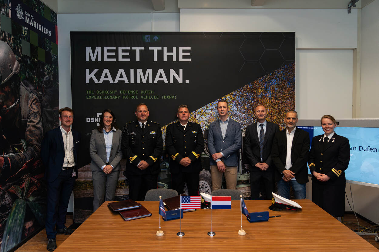 Senior manager International and Science & Technology Contracts Jake Nerenhausen van Oshkosh en Directeur Inkoop Rutger Burger van COMMIT tekenden onlangs voor 150 exemplaren van de zogeheten Oshkosh DXPV, die vanaf 2028 instromen.
