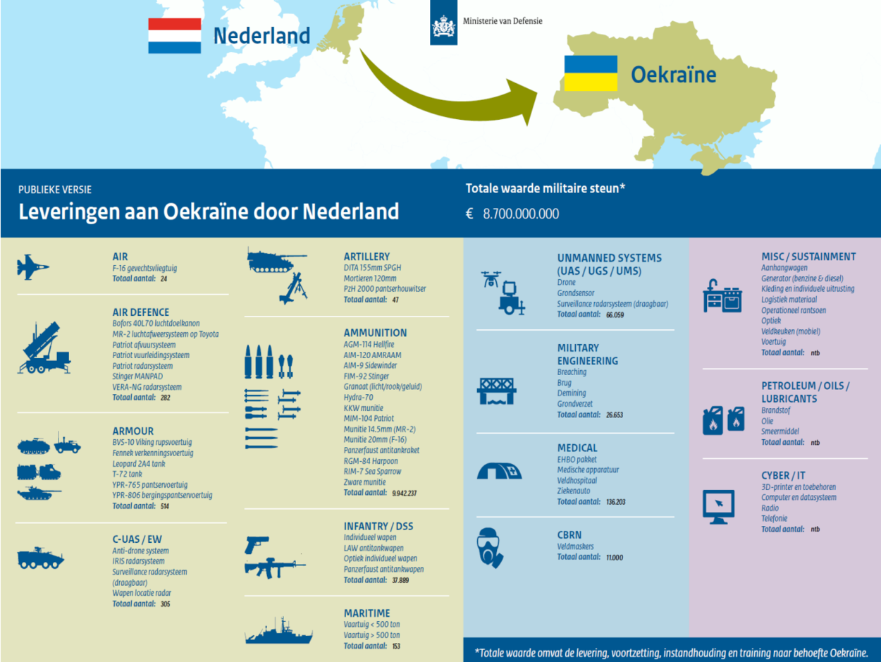 Naast materieel zorgt Nederland ook voor opleidingen. Sinds 2022 is dat onder meer een bijdrage aan operatie Interflex in het Verenigd Koninkrijk om Oekraïense militairen snel en grootschalig te trainen en op te leiden.