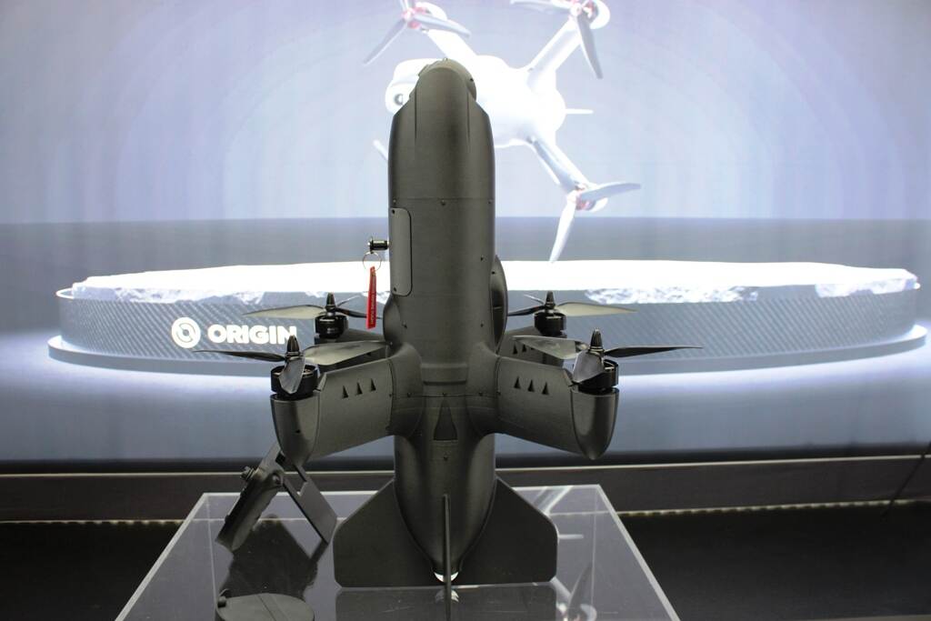 Een futuristisch ogende drone van bovenaf, met vier propellers en een gestroomlijnd, donker grijs frame, op een glazen tafel.