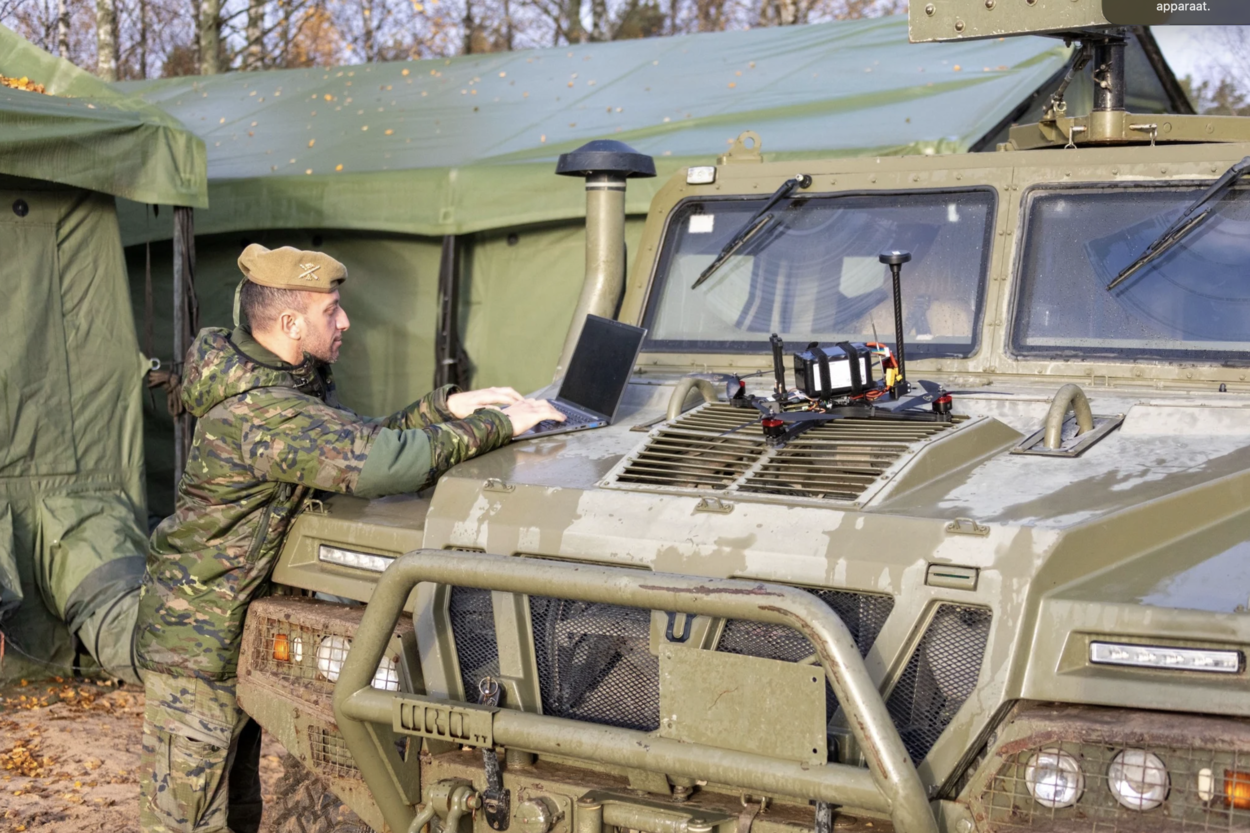 Een soldaat in militair uniform werkt op een laptop die op de motorkap van een groen militair voertuig staat, naast een groene tent.
