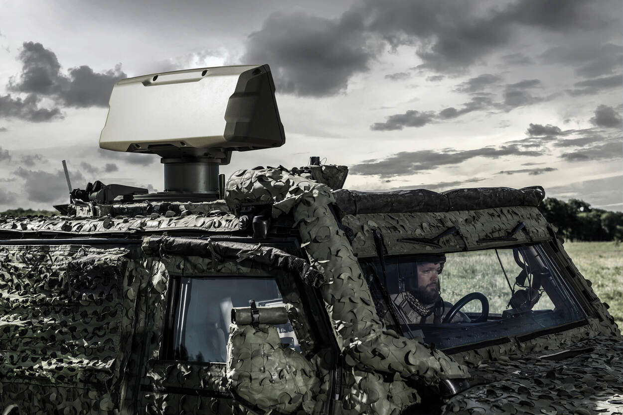 Een militair met baard en een helm op zit achter het stuur van een pantserwagen met camouflagenetten en een radar bovenop het voertuig.