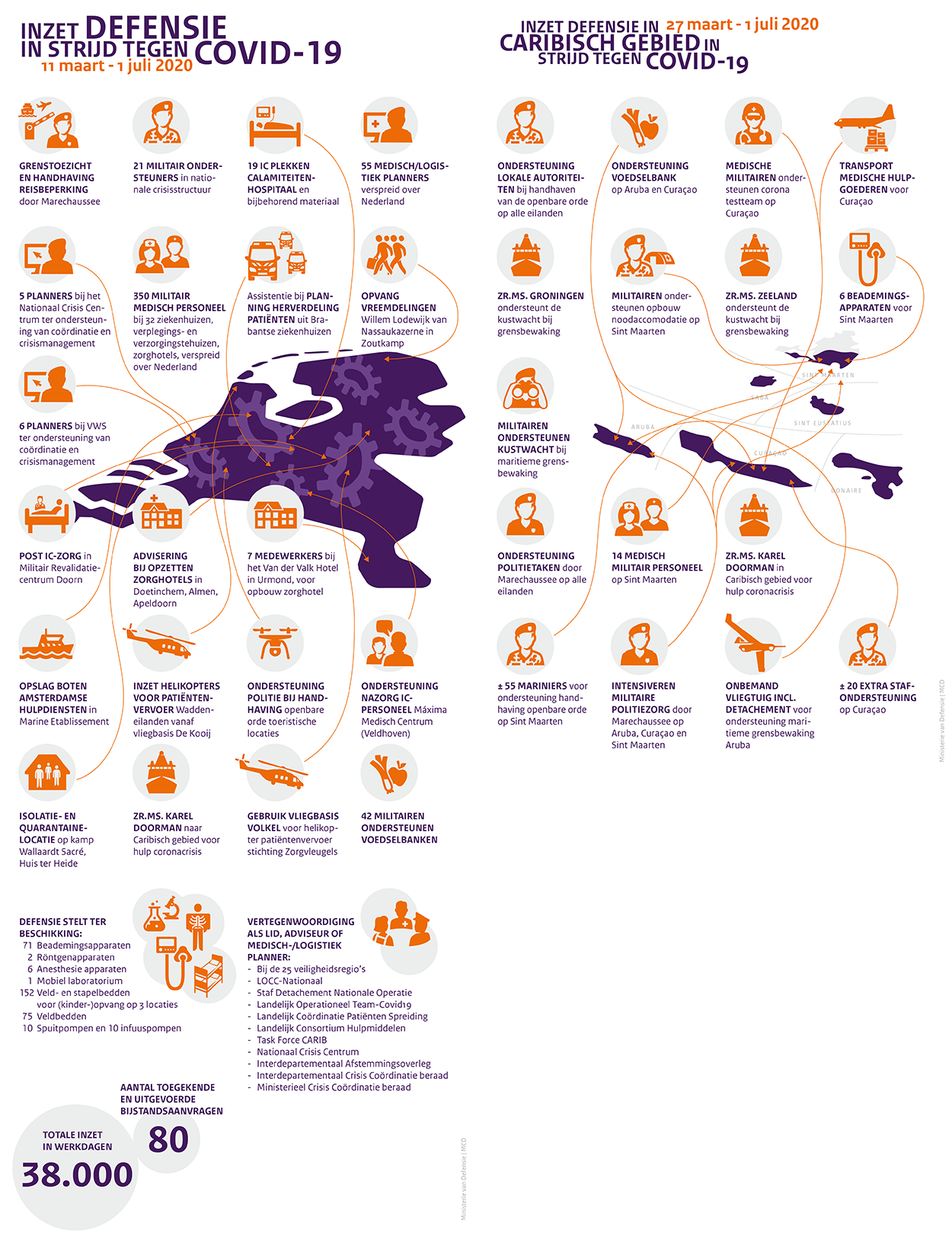 “Er is aan 80 aanvragen gehoor gegeven; oftewel honderden militairen en 327 stuks goederen en apparatuur. Daaronder 2 röntgenapparaten, 152 bedden en 20 spuit- en infuuspompen. Hoeveel collega’s het precies waren is onbekend. Op het hoogtepunt draaiden 400 man tegelijkertijd mee in civiele organisaties. Niet alleen medisch personeel, maar ook marechaussees voor grenstoezicht en handhaving.  Of beveiligers voor de opvang van vreemdelingen op de kazerne in Zoutkamp en HPG’ers die advies gaven op het gebied van Hygiëne en Preventieve Gezondheidszorg (HPG). Vanwege uitzendingen hebben we daar veel ervaring mee.”