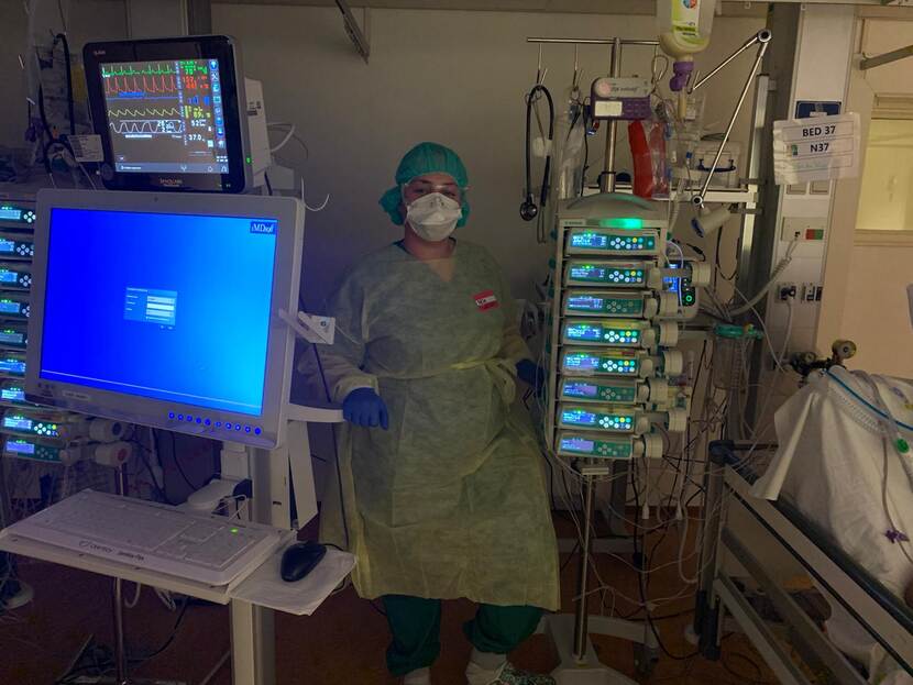 “Ik zou beginnen met mijn AMV-opleiding, toen de marine vroeg of ik ingezet wilde worden voor corona. Ik heb een verpleegkundige-diploma uit de burgermaatschappij op zak en zat thuis omdat de opleiding stillag. Inzet in een burgerziekenhuis leek me vaktechnisch interessant en ik wilde helpen. In Ede kon ik kiezen tussen SEH en IC. Het werd de laatste. Spannend, dit werk had ik nog nooit gedaan. Het was qua coronapatiënten ‘volle bak’. 70 procent van de tijd stond ik ingepakt in beschermende kleding op een ziekenkamer, nam bloed af, draaide patiënten om, stelde apparatuur in, gaf medicatie. De 12-uursdiensten waren pittig. Het mooiste was als een patiënt van de beademing af kon. Er waren ook mindere momenten, zoals toen ik iemand voor het eerst in mijn loopbaan moest afleggen. Ik schrok, maar wist de knop om te zetten. Ondanks corona was mijn tijd in Ede leuk en interessant.”