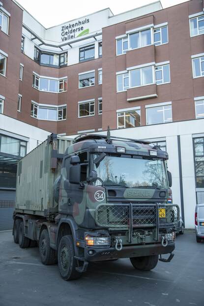 Een vrachtwagen van Defensie levert beademingsapparatuur af bij het Gelderse Vallei Ziekenhuis in Ede. (Foto: Mediacentrum Defensie)
