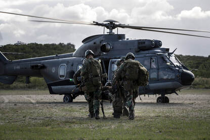Een oefengewonde wordt naar de gereedstaande Cougar gedragen.