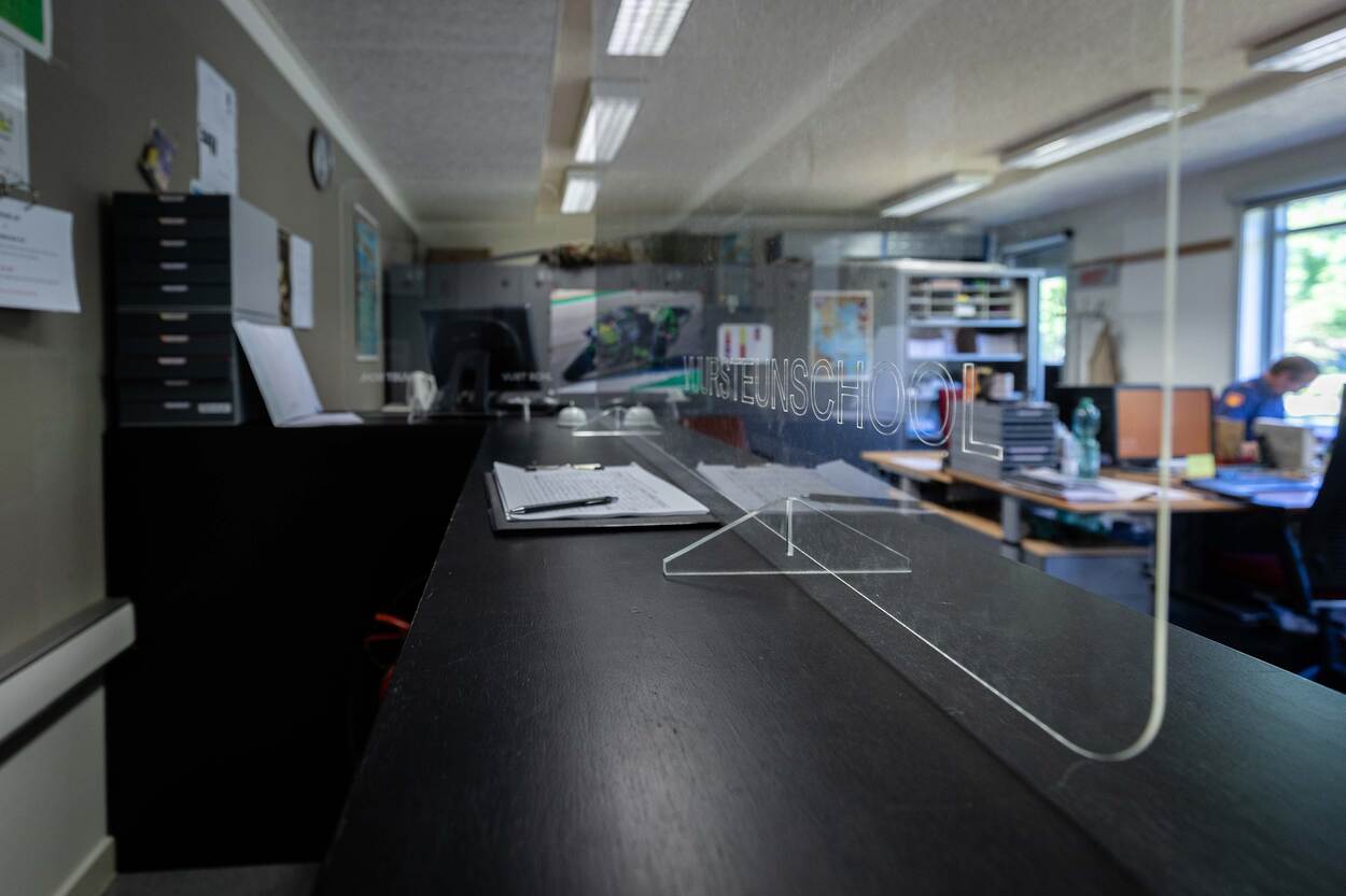 De plexiglasruiten met daarop de schoolnaam gegraveerd, zijn best mooi en ogen professioneel. “Waar het natuurlijk om gaat, is dat iedereen veilig naast elkaar de lessen kan volgen”, slaat Hoofd Geavanceerde Onderwijsleermiddelen eerste luitenant Ludwig de spijker op de kop. De schermen werken naar zijn oordeel goed.