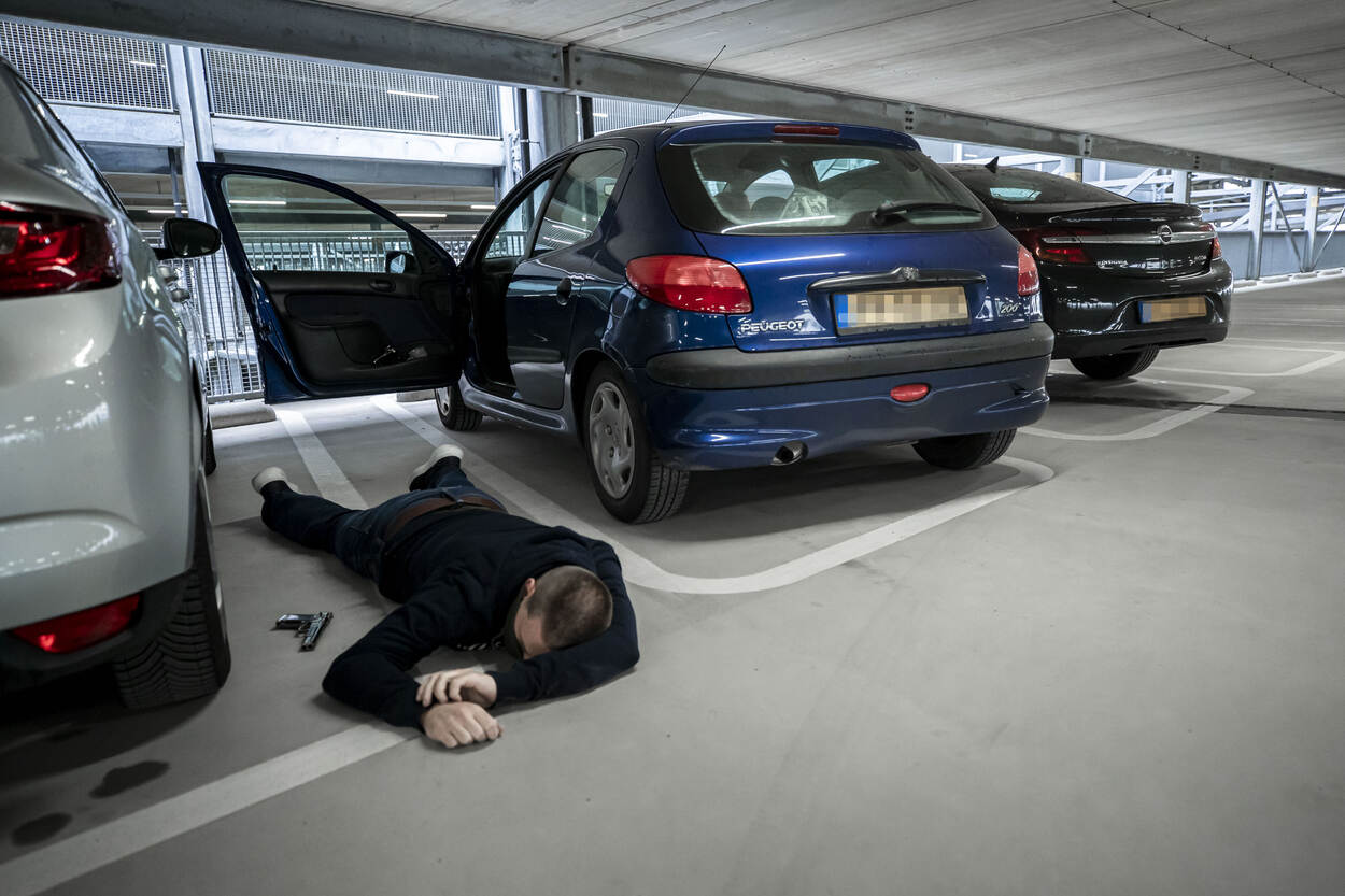 De Snelle Reactie Eenheden (SRE) van de GBB kiezen voor een zo veilig mogelijke benadering en gaan met ballistische schilden richting het voertuig. Collega’s van het Operatiecentrum KMar melden vanuit de Camera Toezicht Ruimte dat er 2 personen in het verdachte voertuig zitten.