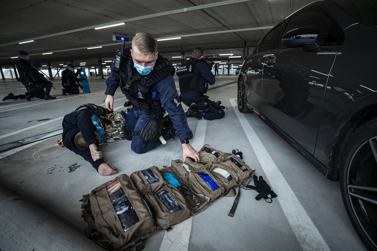 De neergeschoten verdachte wordt zo snel mogelijk naar veiliger, gecontroleerd gebied gebracht en aan zijn verwondingen behandeld. Daarbij wordt gebruik gemaakt van een Mass Casualty Bag (MCB). Ondertussen proberen collega’s de tweede verdachte het voertuig uit te praten.