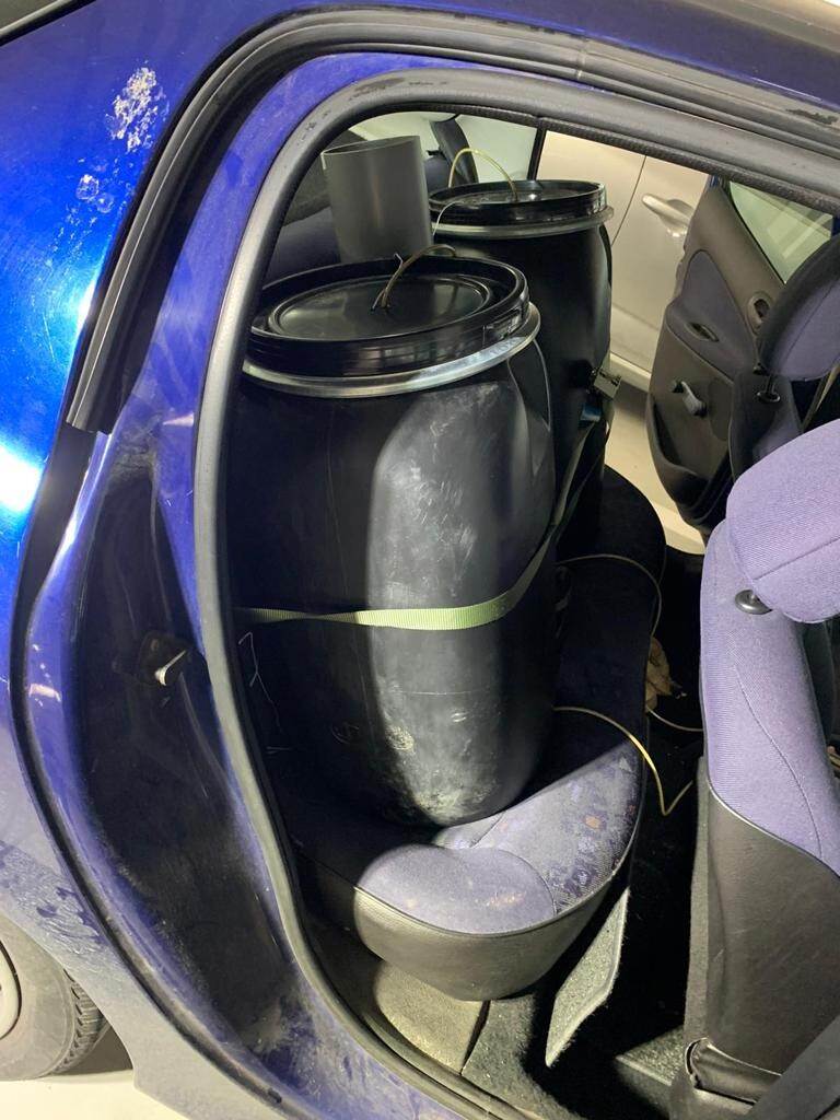 Het ontmantelen van de IED is nauwkeurig werk. Vanaf de versnellingspook blijkt er bedrading te lopen naar 2 grote vaten op de achterbank, die een explosieve stof bevatten.