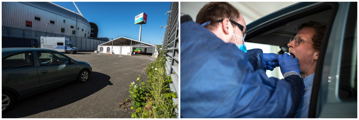 In de bussluis waar normaal supporters van de tegenpartij binnenkomen staat nu een grote tent. Letterlijk in de schaduw van het Haagse voetbalstadion. Ernaast staat een mini-container en een grote grijze bus met defensie-striping. Dit is het mobiele defensielaboratorium. “We kunnen hier onderzoek doen met dezelfde kwaliteitseisen die we gewend zijn in ons eigen laboratorium”, vertelt Bas Mourik, arts-microbioloog in opleiding bij het Leids Universitair Medisch Centrum (LUMC) en projectleider van de teststraat. Hij is blij met de ondersteuning.