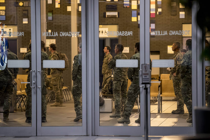 Het onthaal is sober, maar het kan simpelweg niet anders. Afghanistan is in oorlog en Nederland strijdt momenteel tegen een minuscule vijand. “We volgen de richtlijnen van het Rijksinstituut voor Volksgezondheid en Milieu”, legt majoor Gilbert Stout, zegsman van de vliegbasis, uit. Geen van de terugkeerders vertoont symptomen van het coronavirus, desondanks blijft 1,5 meter afstand houden het devies.