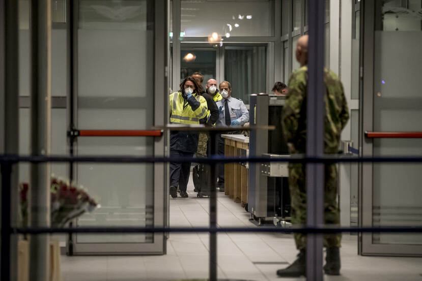 Het personeel op Eindhoven Airport vangt de militairen op, uitgerust met mondkapjes en handschoenen.