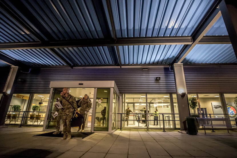 Stilte. De ontvangsthal van de militaire vliegbasis Eindhoven is nagenoeg uitgestorven. Af en toe loopt er een familielid binnen naar het toilet, om vervolgens weer naar de auto te sprinten. De plek waar zij straks hun militair weer ontmoeten. Daar waar familie en vrienden normaliter binnen voor een warm onthaal zorgen, is het nu juist drukte op de parkeerplaats.