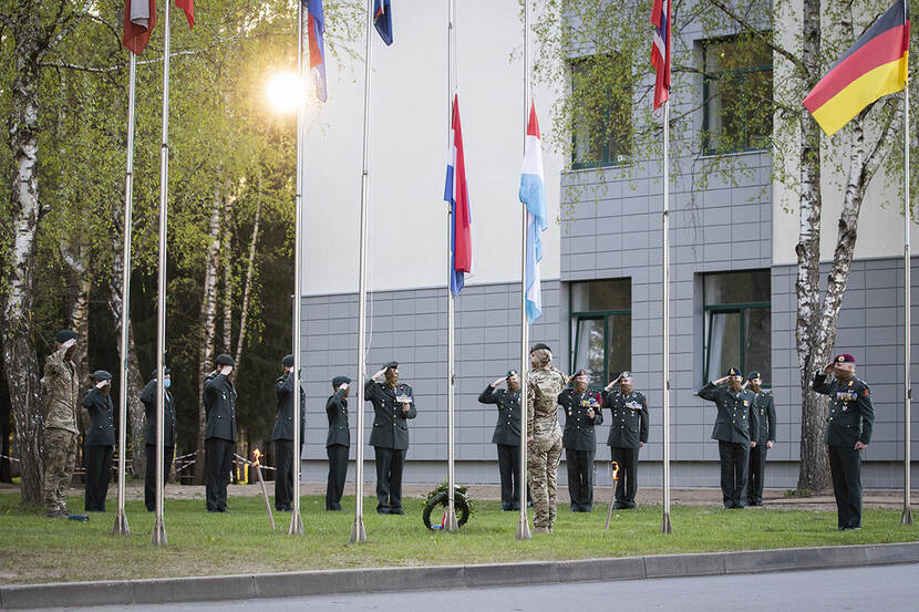 Op de ‘thuisbasis’ van de enhanced Forward Presence-missie in het Litouwse Rukla dragen de militairen uit voorzorg een mondkapje. Dus ook tijdens de Nederlandse Dodenherdenking.