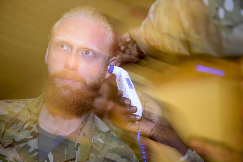 Voor vertrek moesten Nederlandse militairen een medisch checklist invullen. Ook werd de lichaamstemperatuur gemeten om te zien of ze geen coronasymptomen hebben.