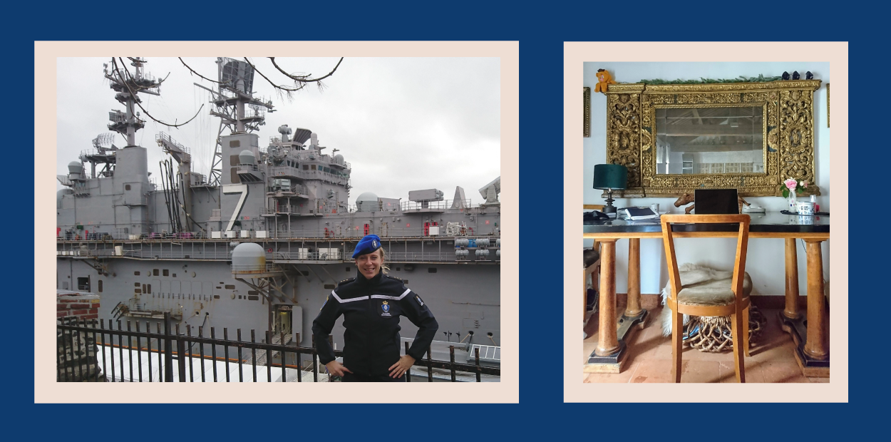 Links: Intell-officer kapitein Linda tijdens een werkbezoek aan Oslo. Rechts: Mijn thuiswerkplek.