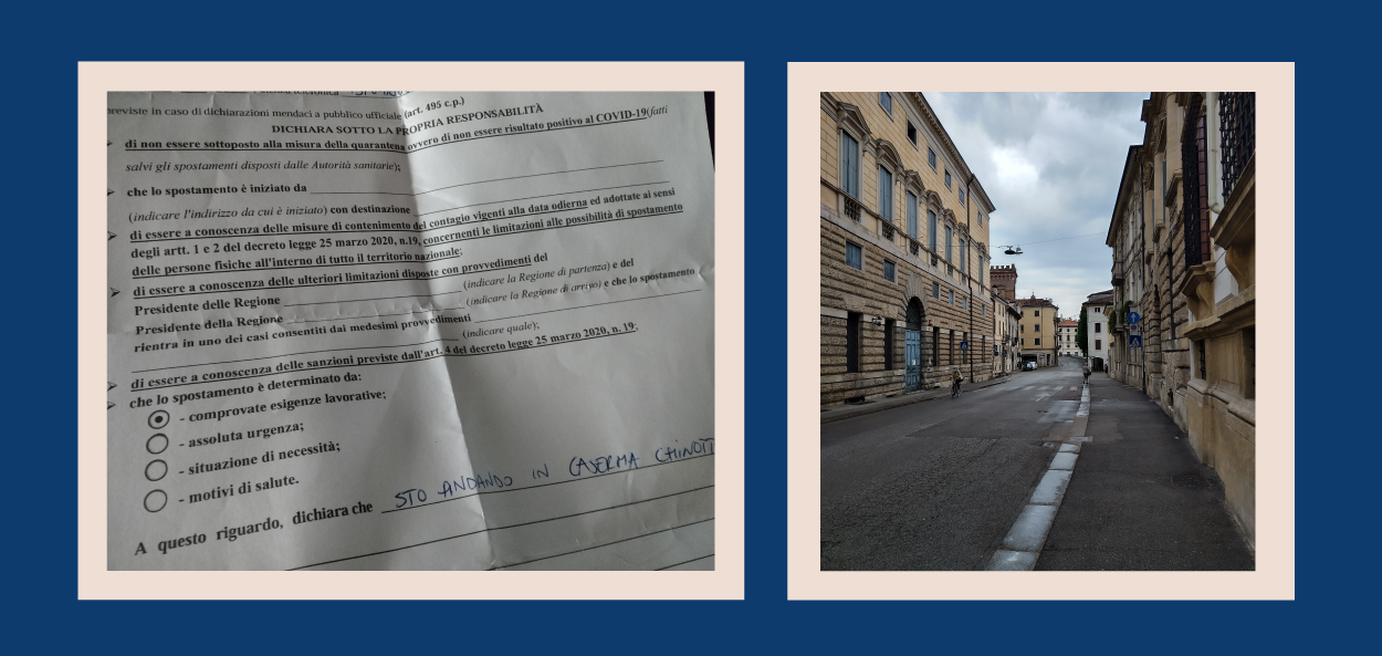 Links: Het 'gewraakte' formulier genaamd autodichiarazione (eigen verklaring). Rechts: Straatbeeld in Vicenza tijdens de lockdown.