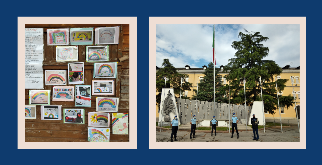 Links: Kindertekeningen met de boodschap ‘andrà tutto bene’ (alles komt goed). Rechts: De KMar-afvaardiging in Vicenza.