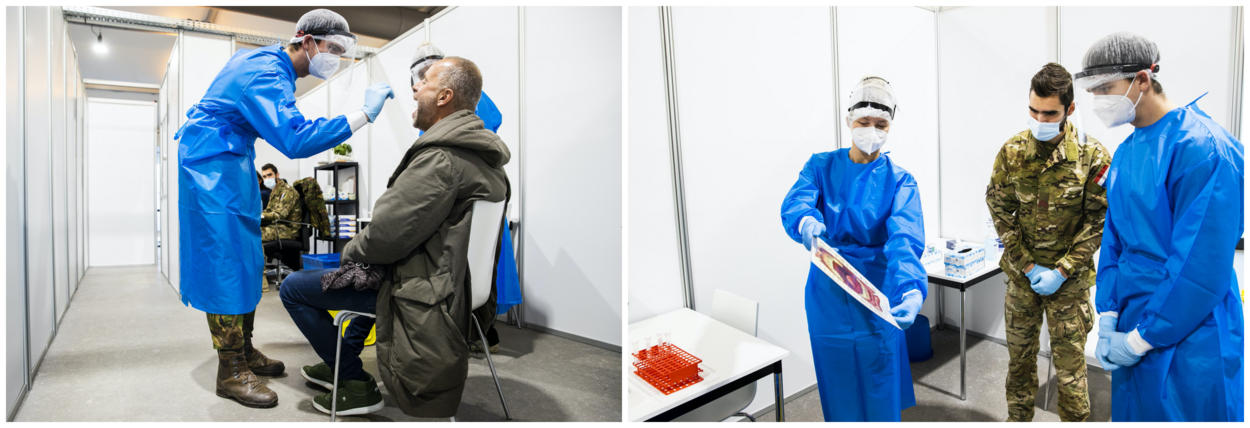 Voor het afnemen van testen en vaccineren stelde Defensie aanvankelijk 750 personen beschikbaar. Daar zijn vorige week nog eens 750 militairen aan toegevoegd. Daarbovenop staan vijfhonderd personen stand-by. Vrijwel deze gehele capaciteit zal de komende weken worden ingezet bij het vaccineren. Waaronder het complete Orkest Koninklijke Luchtmacht. Normaliter zijn zij in deze tijd van het jaar razend druk met kerstconcerten, maar nu zetten de vijftig muzikanten zoveel mogelijk prikken of bieden andere ondersteuning. De muzikanten zijn, net als de honderden collega’s van andere krijgsmachtdelen, daags voor hun inzet opgeleid. Op één locatie in Limburg blijft Defensie coronatesten afnemen.