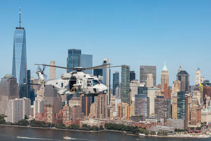 Een NH90 vliegt richting de wolkenkrabbers op Manhattan.
