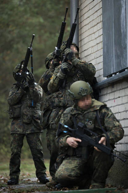 Een aanval op een gebouw waarin zich volgens het oefenscenario Russen schuilhouden.
