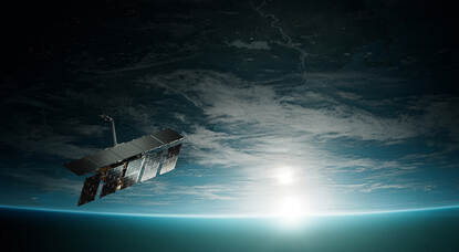 Een weergave van de satelliet in de ruimte, daarachter de bolling van de aarde.
