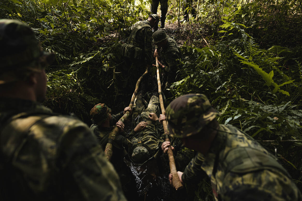 De onderwerpen die tijdens de jungletraining de revue passeren zijn eindeloos. Want natuurlijk is het niet alleen het verplaatsen of knokken in de jungle, maar moet je bijvoorbeeld ook zorgen dat je je rust kunt pakken. Als de hemelsluizen zich openen – en stortregenen kan het daar! – is het wel net zo prettig als je geïmproviseerde onderkomen voldoet aan je eisen. Soldaat-1 Chris (niet op de foto, red.): “Je zweet je een ongeluk en het is echt heel zwaar. Wel is het een hele mooie training voor jezelf. Op veel vlakken word je hier gewoon echt een hele goede militair van, omdat je wordt gedwongen om je drills goed toe te passen. Anders word je keihard afgestraft, wat maakt dat er een extra, mentale component aan zit.”