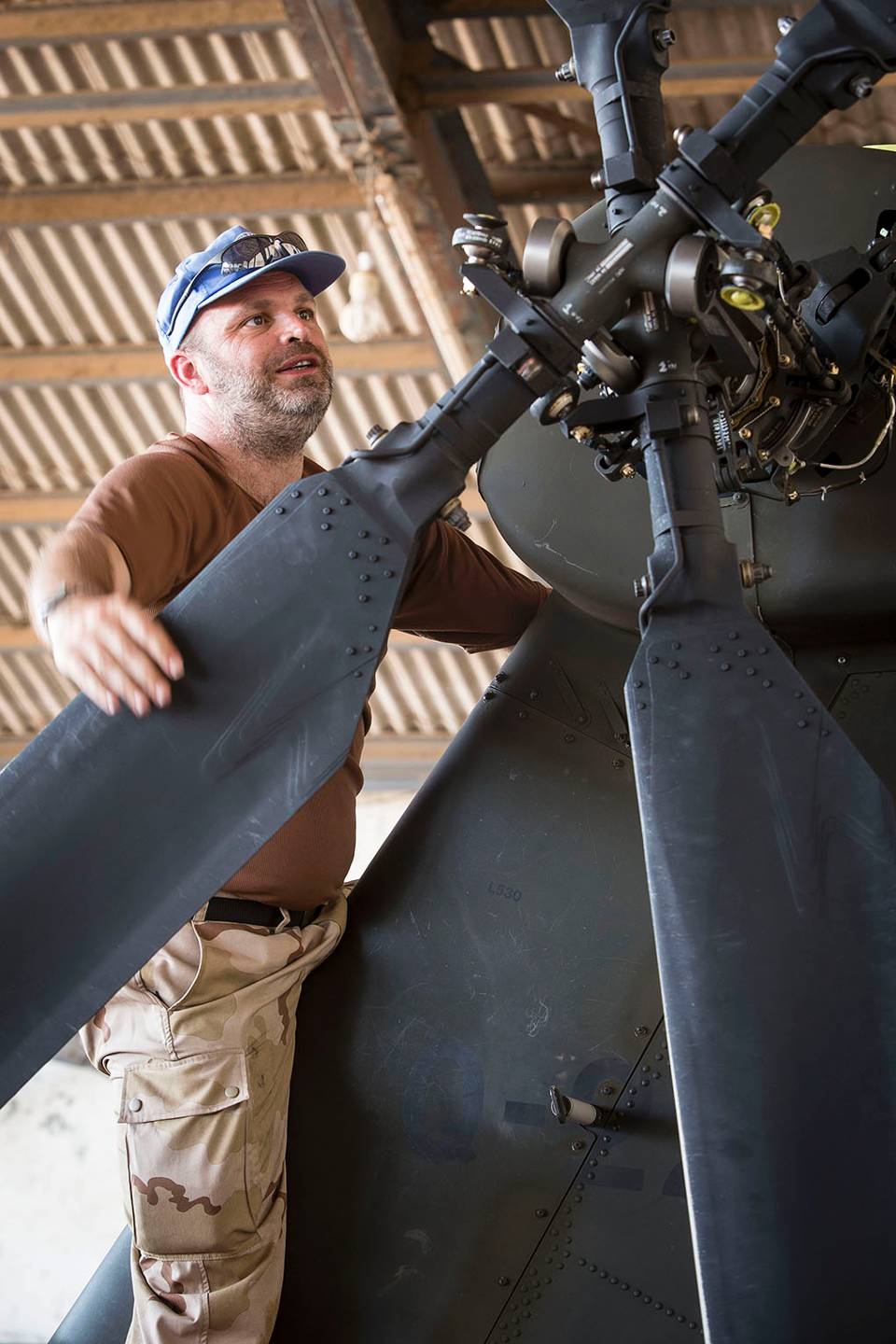 Als de rotorbladen zijn afgesteld, de balans gecontroleerd en de inspectie gedaan, is het de beurt aan testvlieger kapitein Dylan. Hij is de enige die na onderhoud de kist operationeel mag verklaren, omdat hij een aanvullende technische opleiding heeft. ‘In een aantal runs meten we alles door. Dat heeft vooral met de balans te maken’, zegt Dylan. ‘We beginnen op de grond met draaiende rotorbladen, daarna hooveren en tot slot vliegen we op verschillende snelheden heen en weer.’ Bij het testvliegen blijkt maar weer hoe belangrijk het samenspel tussen de vlieger en technische crew is. Elke storing wordt voortvarend opgepakt. Na enkele uren is Dylan tevreden. Een andere vlieger zal de kist naar Gao brengen. Deze ferry gebeurt in tweetallen om wederzijdse steun te kunnen garanderen.