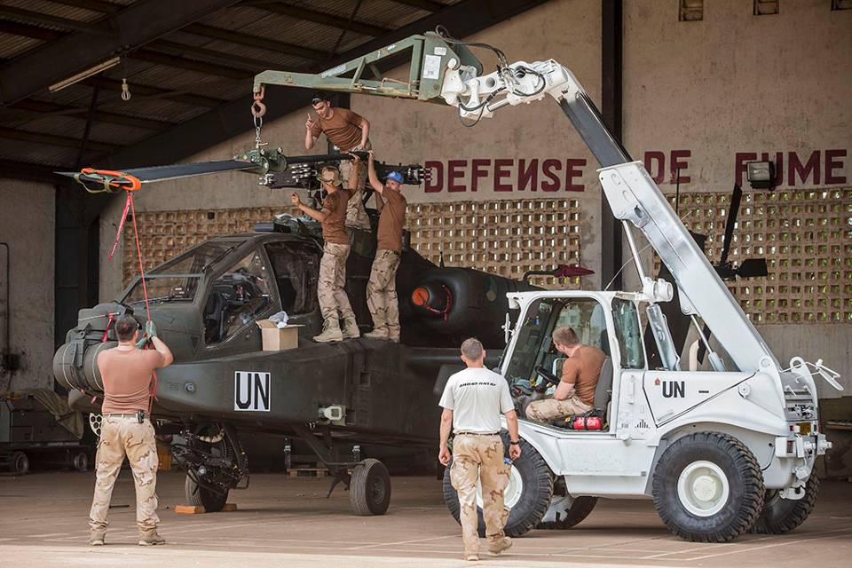 Het zweet gutst van de ruggen. De Malinese zon brandt vanochtend al goed – net zoals iedere dag eigenlijk. In de vervallen hangaar aan de rand van het vliegveld van Bamako verdringen monteurs en technici zich rond de 2 Apaches. De toestellen zijn de dag ervoor door een Antonov 124 naar de Malinese hoofdstad vervoerd. Hier zet de technische dienst ze in elkaar zodat ze zelfstandig naar het Nederlandse basiskamp in Gao kunnen vliegen.
