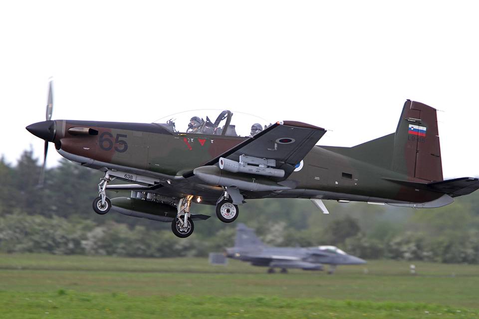 Tijdens enkele missies zorgen Sloveens PC-9’s vanaf Jagel voor de slow mover proctection van de transportvliegtuigen. Foto: Arno Marchand
