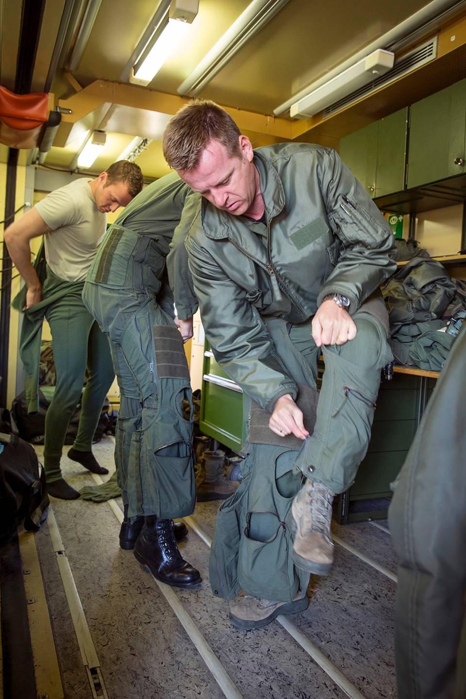 Foto’s boven en links: Voorbereiding van de Volkelse vliegers onder wie detco majoor Theo (voorgrond) op een nieuwe Jawtex-missie. De oefeningen bestrijkt eigenlijk heel noord-Duitsland, vanaf de voormalige vliegbasis Twenthe naar het noorden. Foto’s: Rob Gieling