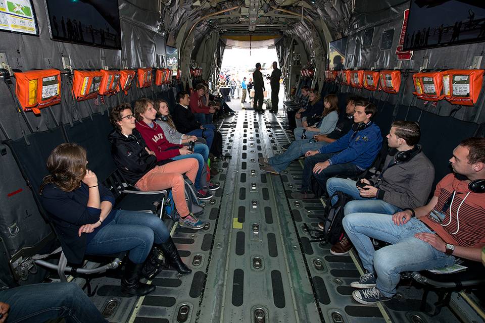 Terug op Gilze-Rijen vormt een C-130 het kruispunt van de static show en de shelterarea. De Hercules is er zeker niet alleen om naar te kijken, maar biedt ook het onderkomen voor zogenoemde masterclasses. Op beide dagen zijn er 5 voor steeds een selecte groep van 40 HBO- en WO-studenten. In het ruim van het transportvliegtuig krijgen deze potentieel geïnteresseerden in een baan bij de luchtmacht, steeds door een andere spreker, meer kennis en over het werk van de luchtmacht – nu en in de toekomst. (Foto: sergeant-majoor Gerben van Es)