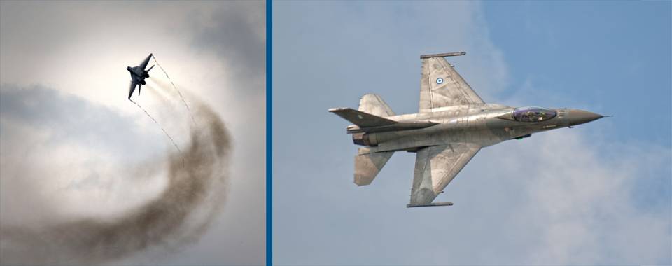 Wederom twee primeurs in de vliegshow: een MiG-29 uit Slowakije en F-16 uit Griekenland. Foto links: sergeant-majoor Gerben van Es. Foto rechts: Gostar den Daas, www.aviamagazine.com