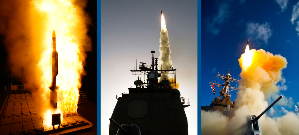 Lanceringen van Standard Missiles 3 vanaf Aegis cruisers van de US Navy. Foto’s: US Navy